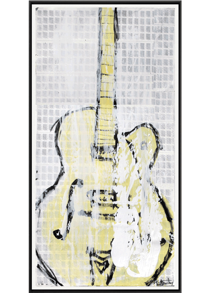 This unique piece of art, entitled "Yellow Gretsch", was created by Tim Armstrong. It is a one-of-a-kind original created using a variety of mixed media materials, such as charcoal, watercolor, house paint, spray paint and collage, all on ripped canvas.